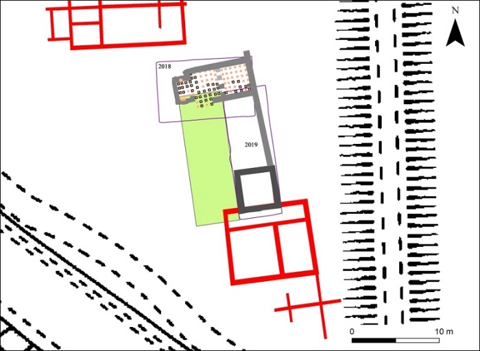 The 2021 excavation took place between Tuesday 31st August and Tuesday 14th September 2021. A trench approximately 15m by 5m was excavated (shaded green on the map below) to expose an area between and including the southern wall of Building 2 and the northern walls of Building 3, immediately to the west of the area investigated in 2019. A detailed report will follow in due course.