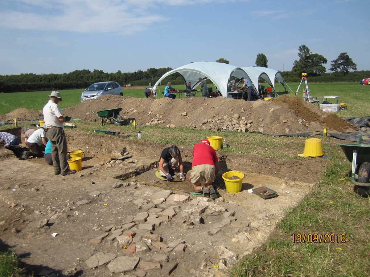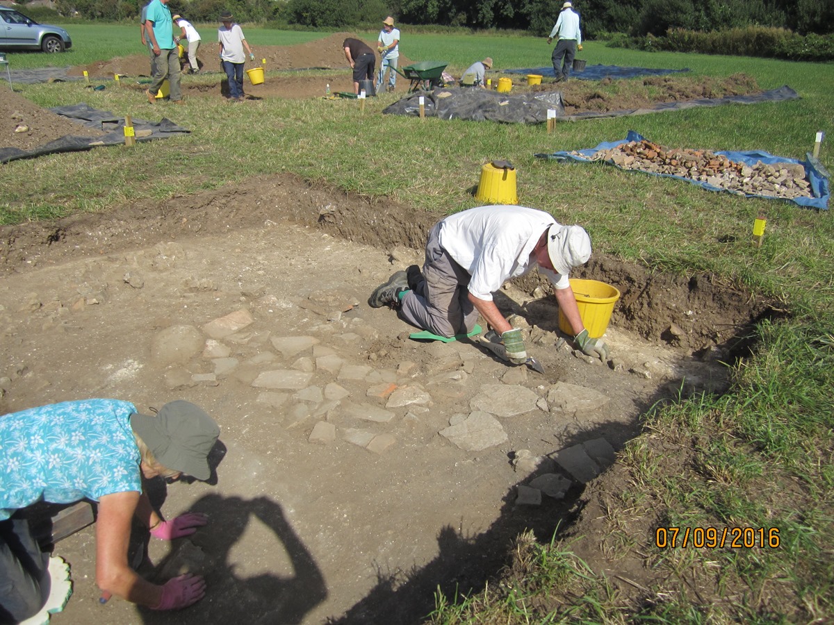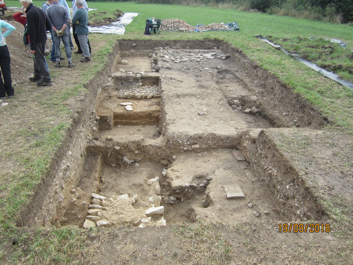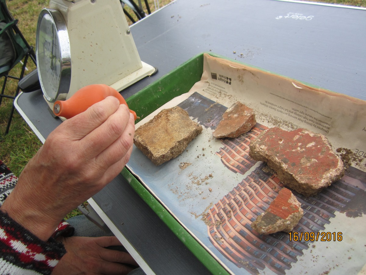 Trench 2. 4m x 8m placed on the western side of the rectangular building and including some of the dark mass to the west shown on survey results. This revealed that there was a separation between the rectangular building and a further building to the west. As is always the case it was during the final Friday and Saturday that things got really exciting. A significant stone build wall was revealed along with a hypocaust floor that overlaid earlier building material. I had thought that the volumes of Ceramic Building Material (CBM) and stone would not exceed last year’s but they did with the CBM weighing in at 485Kg an increase of 38%. The painted wall plaster was particularly interesting.